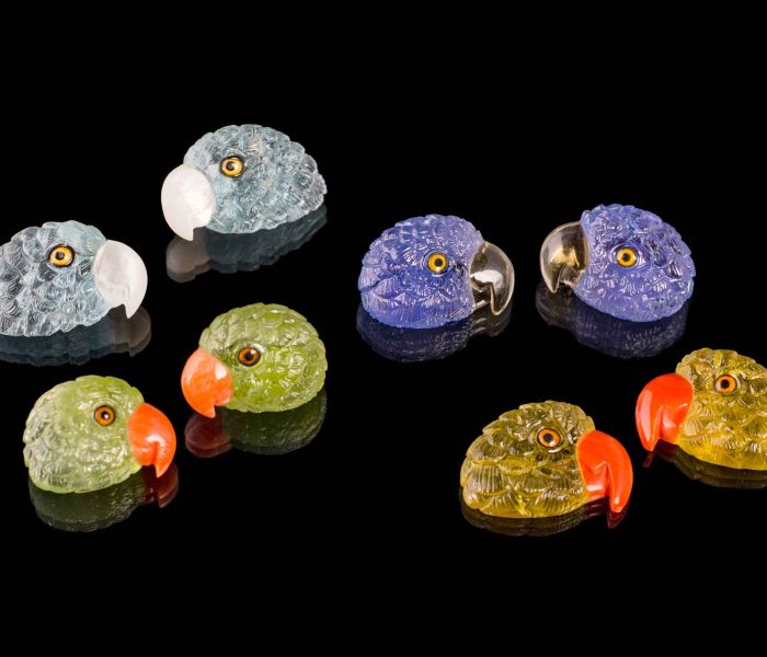 Tansanite parrots heads with onyx beak, 15 x 11 x 6,9 mm